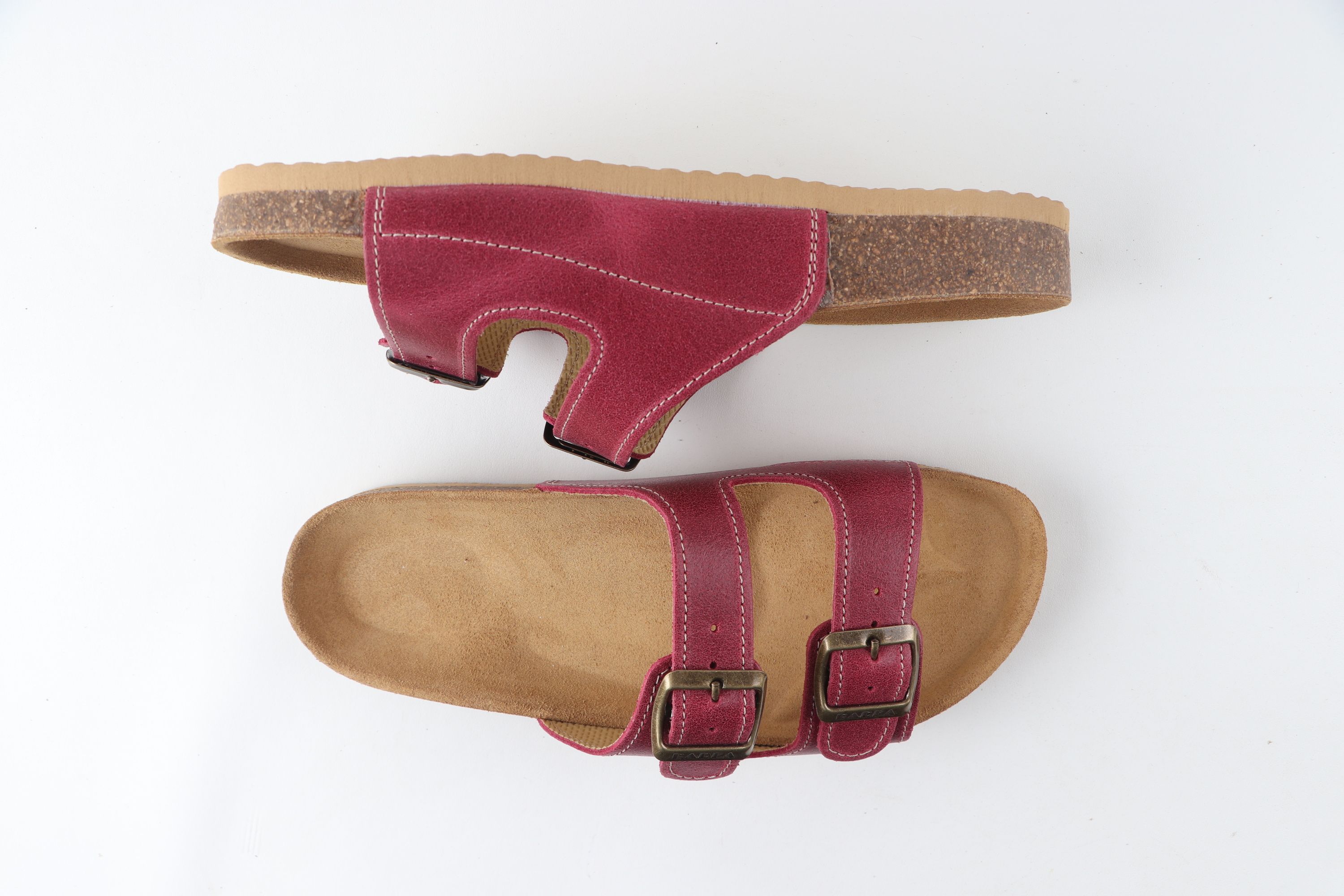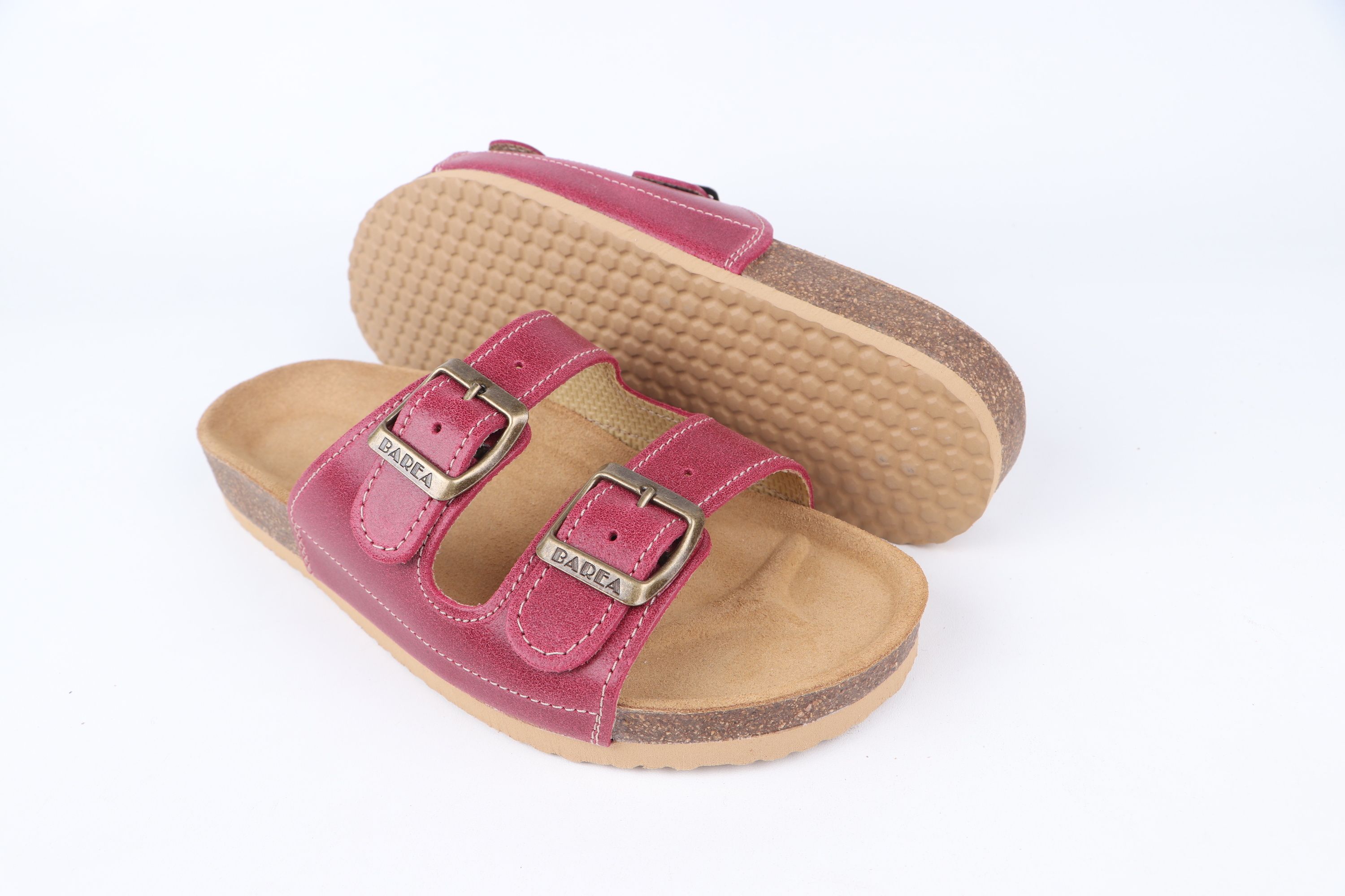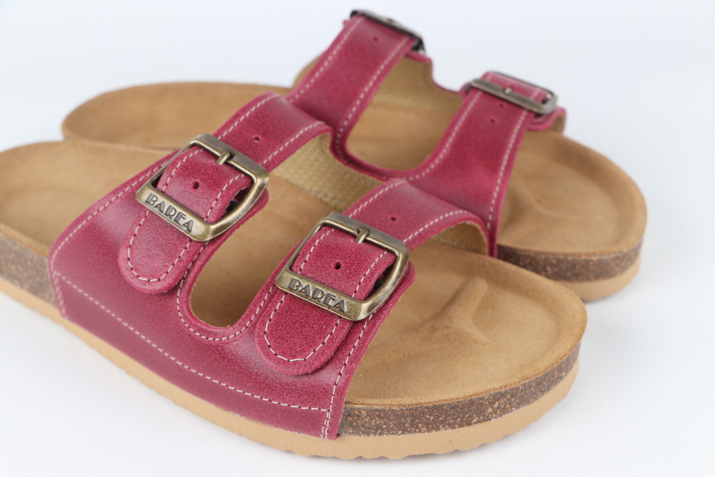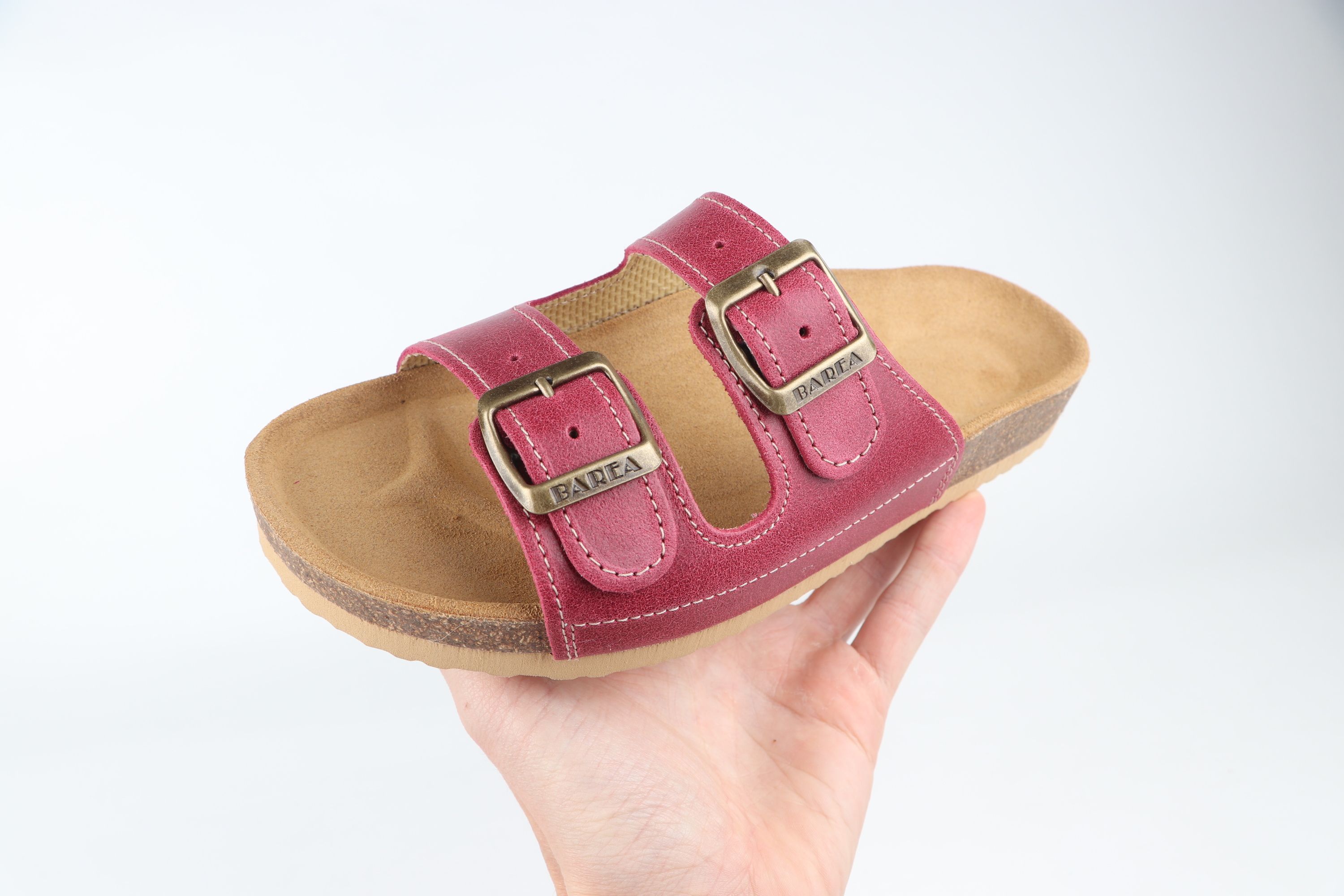 Nadčasové celokožené šľapky Barea vynikajú svojou jednoduchosťou a pohodlnosťou. Prezuvky sú vhodné do interiéru (ako školská, kancelárska, domáca i prezuvková obuv) alebo do suchého exteriéru (ako vychádzková obuv). Dvojprackový celokožený (pravá hovädzia koža) cyklámenový zvršok sa dokonale prispôsobuje líniám chodidla, a tak zabezpečuje kvalitnú oporu z oboch strán po celej svojej dĺžke. Stielka je korková (prírodný korok), anatomicky tvarovaná pre podporu priečnej aj pozdĺžnej klenby, potiahnutá béžovou kožou (pravá hovädzia koža), podporuje správne držanie chrbtice a komfortnú chôdzu. Podošva je rovná, béžovej farby, vyrábaná z tvrdeného styroporu. Model vyrábame ručným spôsobom na Slovensku, lepením a zalisovaním korkovej stielky na styroporovú podošvu. Obuv nedržíme na sklade. Vyrábame ju na základe Vašej objednávky do 96 h. po prijatí platby.
