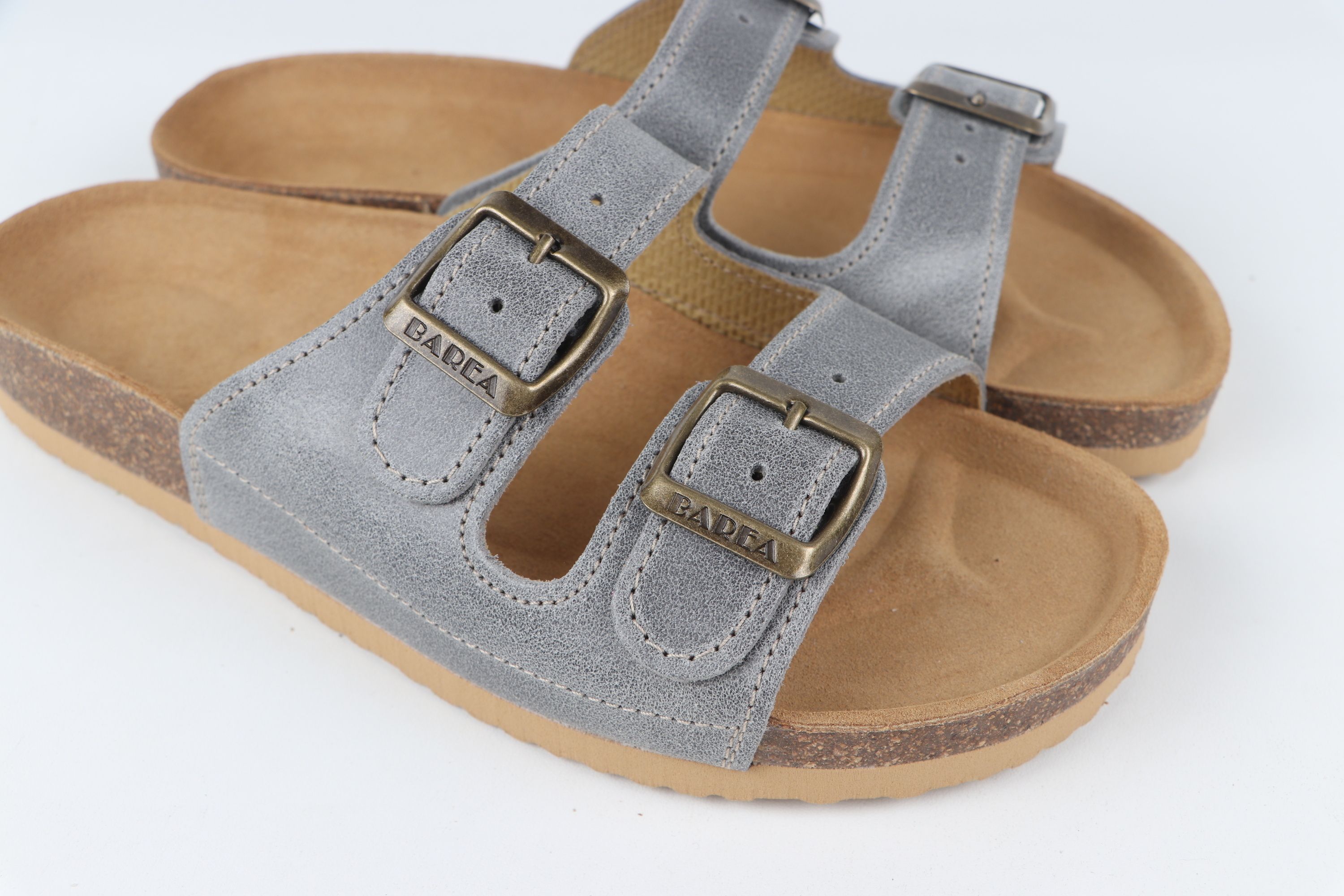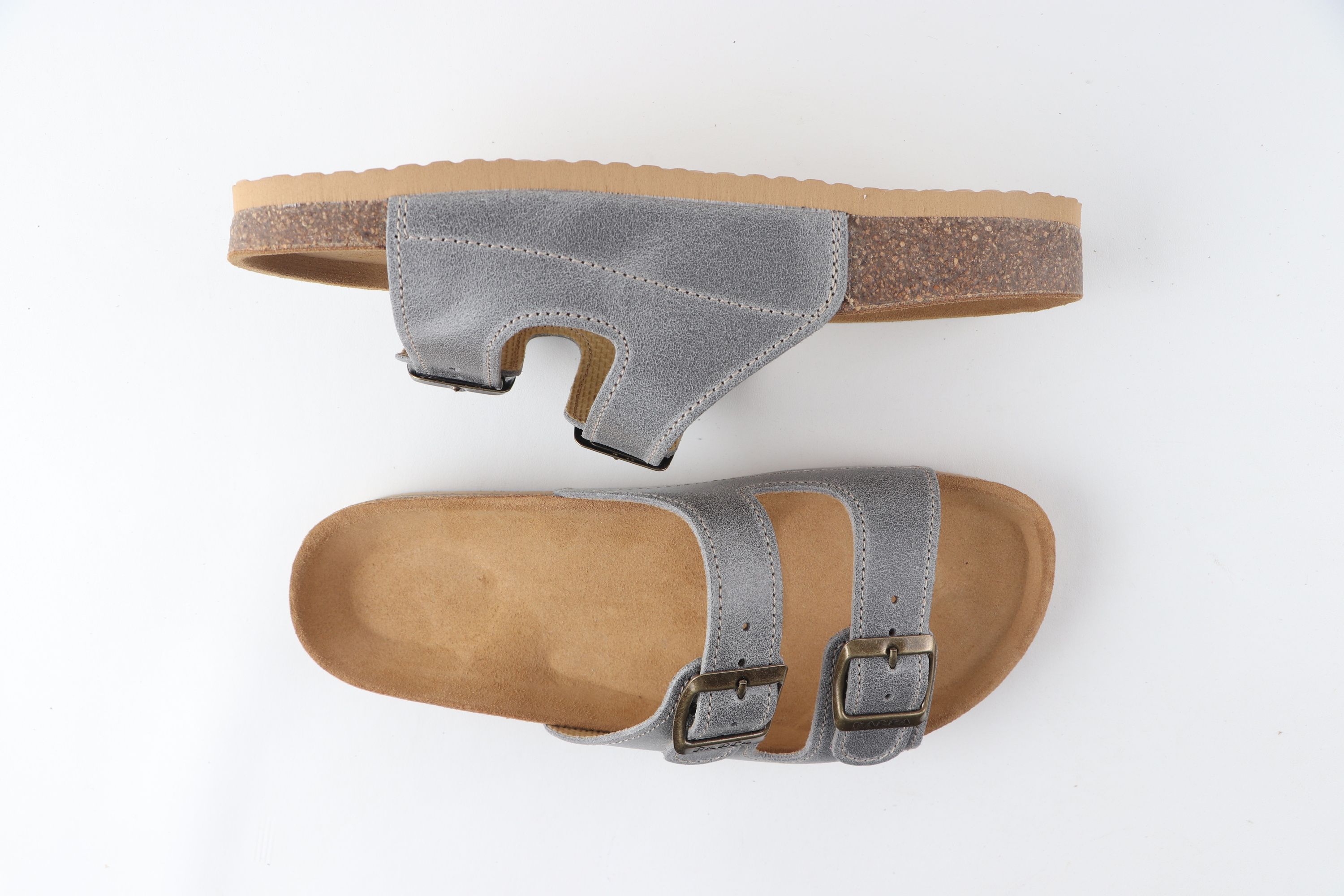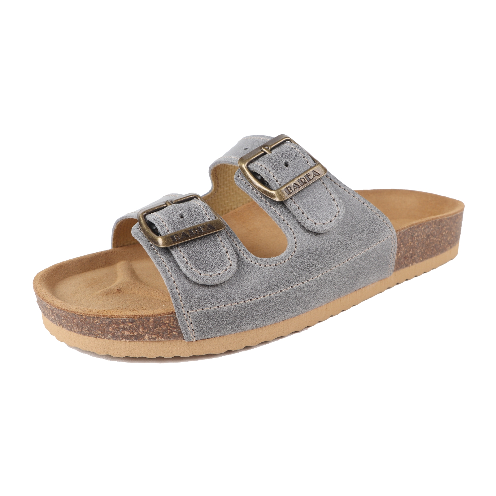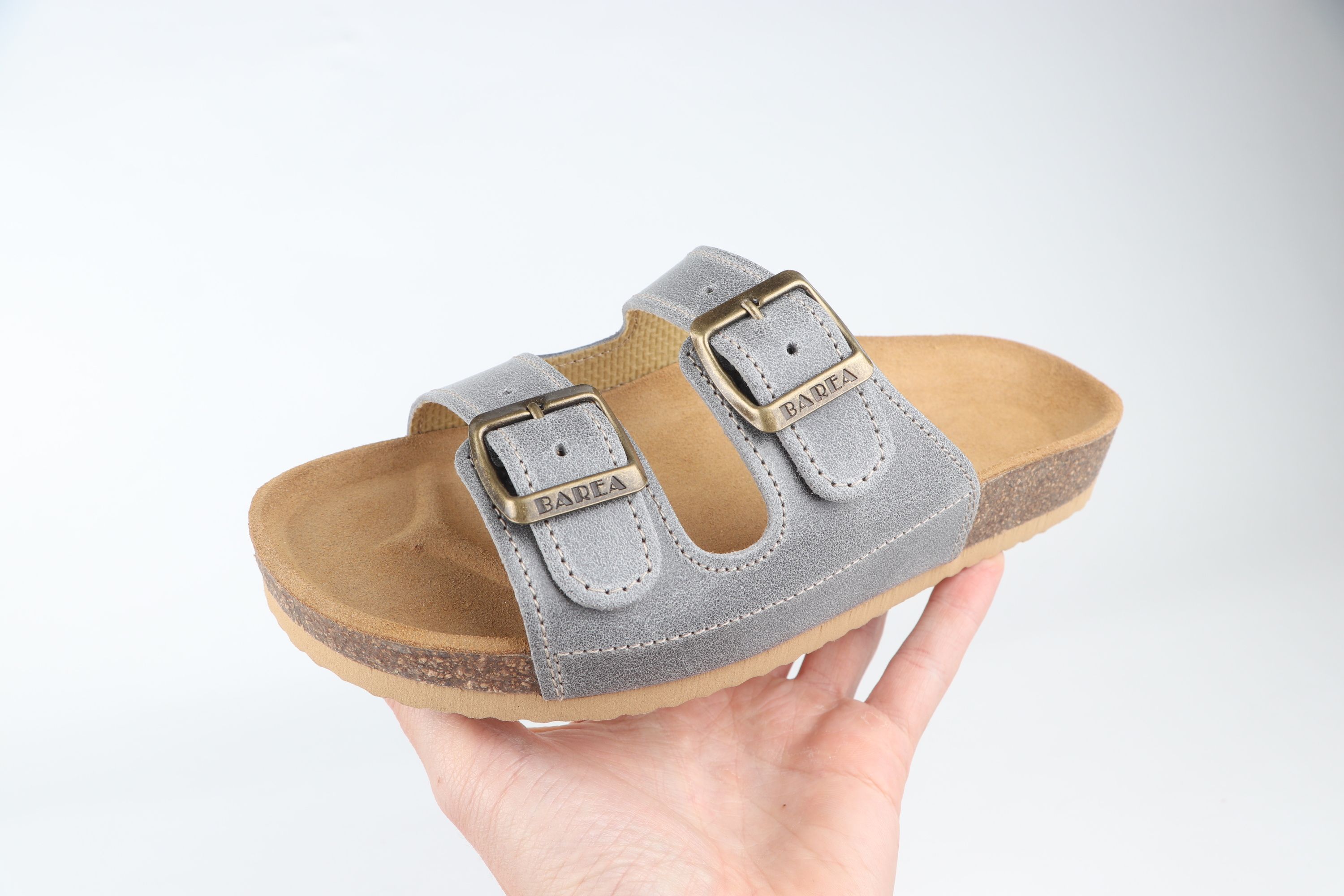 Nadčasové celokožené šľapky Barea vynikajú svojou jednoduchosťou a pohodlnosťou. Prezuvky sú vhodné do interiéru (ako školská, kancelárska, domáca i prezuvková obuv) alebo do suchého exteriéru (ako vychádzková obuv). Dvojprackový celokožený (pravá hovädzia koža) jednofarebný zvršok sivej farby sa dokonale prispôsobuje líniám chodidla, a tak zabezpečuje kvalitnú oporu z oboch strán po celej svojej dĺžke. Stielka je korková (prírodný korok), anatomicky tvarovaná pre podporu priečnej aj pozdĺžnej klenby, potiahnutá béžovou kožou (pravá hovädzia koža), podporuje správne držanie chrbtice a komfortnú chôdzu. Podošva je rovná, béžovej farby, vyrábaná z tvrdeného styroporu. Model vyrábame ručným spôsobom na Slovensku, lepením a zalisovaním korkovej stielky na styroporovú podošvu. Obuv nedržíme na sklade. Vyrábame ju na základe Vašej objednávky do 96 h. po prijatí platby.